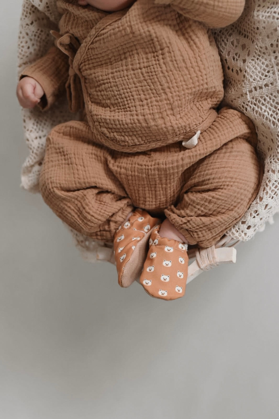 „Damit ihr lange Freude an unseren weichen Schuhen habt, bitte nicht auf rauem Untergrund wie Asphalt oder Kieswegen krabbeln.“